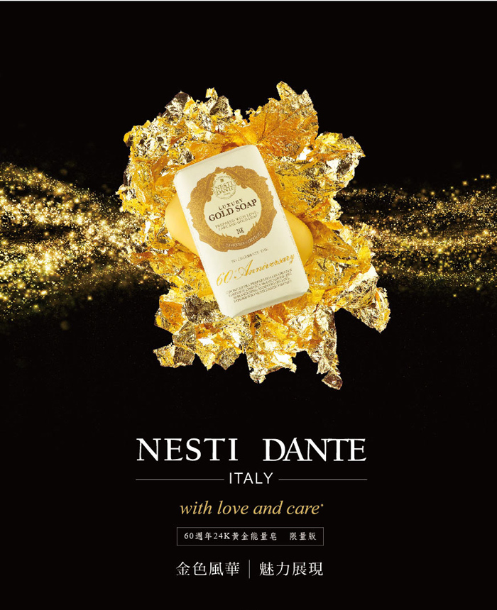 為了慶祝Dante 先生在佛羅倫斯開始了他的第一個熱鍋爐到今年的60年黃金週年,Nesti香皂專家特別以昂貴的金箔葉為原料,打造出一款重250克的黃金尊貴香皂,這是一款為大家所喜愛且充滿過去、現代及未來主義美學的超高價值產品。